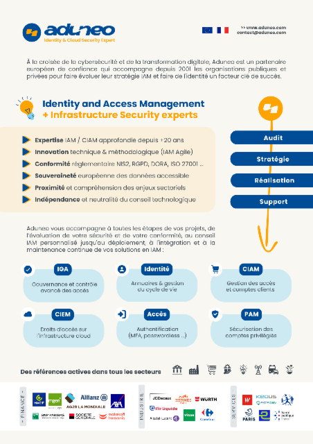 Aduneo, fort de 20+ ans d'expertise IAM-CIAM, accompagne vos projets de gestion des identités et accès (IAM, CIAM, SSO, MFA, PAM, gouvernance) et de transformation digitale. Spécialistes des solutions éditeurs (One Identity, Ping, Saviynt, Memority, Microsoft...) et Open Source (Keycloak...), nous proposons un accompagnement complet : conseil, formation, réalisation et support. Notre expertise transverse (on-premise, cloud, multi-cloud) et notre expérience sectorielle nous permettent de comprendre vos défis de sécurité, de productivité, de conformité ou de souveraineté numérique, pour vous proposer des solutions sur-mesure.